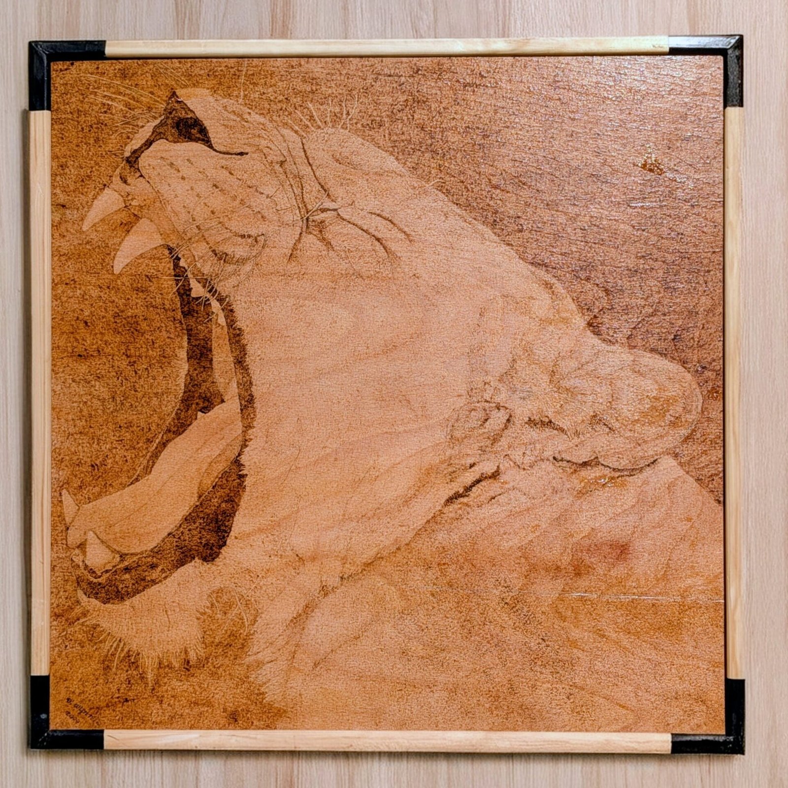 Bring raw power and elegance into your space with this hand‑burned close‑up pyrography of a roaring lioness, crafted over 100 hours on a premium 60cm x 60cm hardwood board. Every detail is meticulously burned to create lifelike depth and texture. Finished with a protective seal and mounted in a light wood frame, this striking wildlife artwork is ready to hang and designed to be a bold focal point in any room.